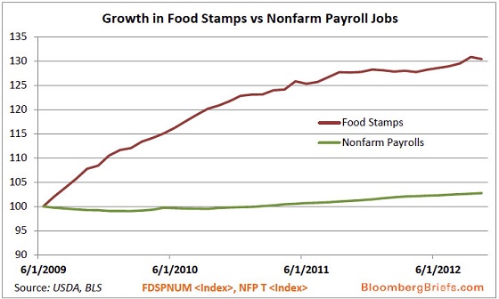 Sinds juni 2009 is het totaal aantal banen volgens de non-farm payroll data met slechts 2% aangegroeid. Over diezelfde periode is het aantal aanvragen voor voedselbonnen veel harder gestegen, namelijk met 30%. Momenteel zijn er meer dan 48 miljoen Amerikanen die aanspraak maken op deze voedselbonnen. Bloomberg schrijft dat er in de eerste tien maanden van 2012 ongeveer 1,01 miljoen mensen zijn toegevoegd aan het Supplemental Nutrition Assistance Program (SNAP). In diezelfde periode kwamen er 1,5 miljoen banen bij, een stijging van 1,1% op het totaal aantal arbeidsplaaten. Onderstaande grafiek geeft de lange termijn trend weer van de arbeidsmarkt en de voedselbonnenconsumptie, beginnend bij een indexcijfer van 100 in juni 2009.