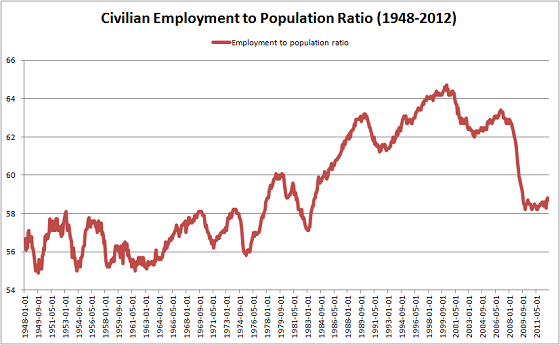 Via twitter werd ik gewezen op de Civilian Employment-Population Ratio. Ook deze grafiek zien we zo nu en dan voorbij komen. Deze indicator meet het percentage Amerikanen met een baan ten opzichte van de totale volwassen bevolking. Ook hier zien we nauwelijks herstel na de klap van 2008 en 2009.
