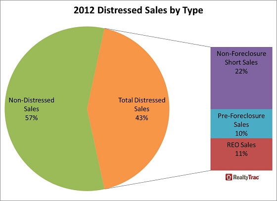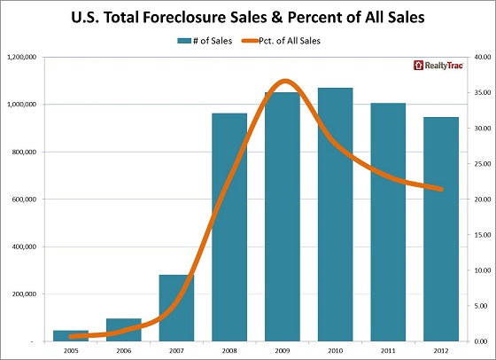 Deze 'foreclosure relates sales' waren goed voor 21% van alle verkochten woningen in de VS over heel 2012, tegenover 23% en 28% van alle verkopen in respectievelijk 2011 en 2010. Daaaast werd er op ongeveer 10% van alle verkochte woningen een verlies geleden door de bank, omdat de waarde van de woning lager was dan het openstaande hypotheekbedrag. In de VS worden deze verliezen overigens gedragen door de bank en niet door de eigenaar van de woning. Tenslotte was 11% van de verkochte woningen afkomstig van de woningvoorraad van banken, woningen die eerder in beslag genomen zijn en die nog een koper moesten vinden. Ook op deze woningen moet de bank doorgaans een verlies nemen, want op de veiling brengen deze in beslag genomen woningen doorgaans veel minder geld op.