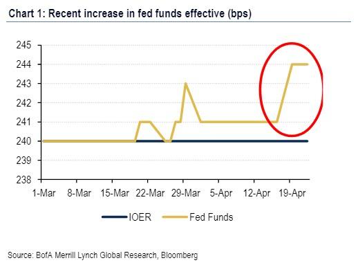 Federal Funds rate ligt al weken hoger dan rente op overtollige reserves (Bron: Bank of America Merrill Lynch, Bloomberg)