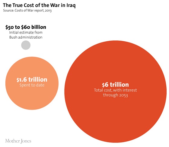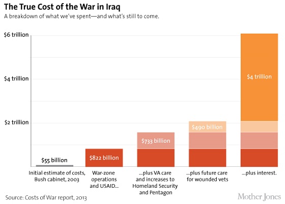 Omdat de oorlog gefinancierd is met geleend geld zijn de uiteindelijke kosten aan het eind van de rit nog hoger, zo schrifjt Motherjones.com. Dertig onderzoekers die een rapport samenstelden over de kosten van de Irak oorlog becijferden dat alleen de rentekosten tot en met 2053 aangegroeid zullen zijn tot $4 biljoen. Met de kosten van de oorlog zelf gaat de totale som richting de $6 biljoen.