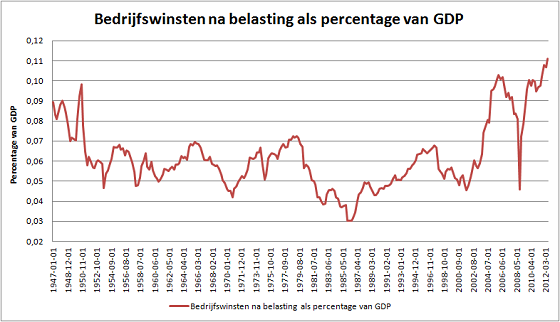 Bedrijfwinsten na belasting als percentage van GDP (Bron: St. Louis Fed)