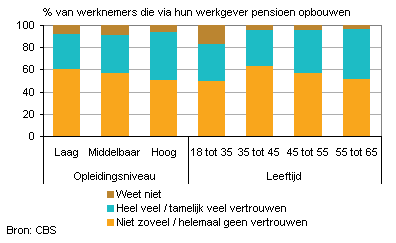 Onderstaand cirkeldiagram van het CBS laat zien hoe de respondenten van het onderzoek denken over hun pensioenfonds. Bijna één op de tien heeft helemaal geen vertrouwen meer in hun pensioenfonds. Maar 3% heeft er nog wel heel veel vertrouwen in. Ongeveer een derde is nog tamelijk positief over de pensioenaanbieder.