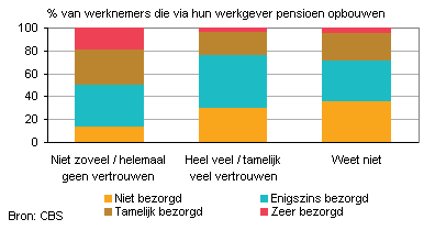 Van de lager opgeleide werknemers gaf 60% aan geen of weinig vertrouwen te hebben in hun pensioenfonds, bij de hoger opgeleiden lag dit aandeel op 51%. Een ander opvallend gegeven is dat de jongste werknemers, die aan het begin van de pensioenopbouw staan, twee keer zo vaak als gemiddeld aangeven het helemaal niet te weten of er geen mening over te hebben (17%). De bezorgdheid over de hoogte van het pensioen is uiteraard het grootst bij de respondenten die hebben aangegeven weinig vertrouwen te hebben in hun pensioenfonds. De tweede grafiek hieronder brengt dat in beeld.