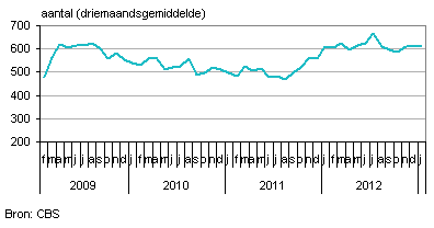 Aantal faillissementen in Nederland, gemeten als het driemaandsgemiddelde (Bron: CBS)