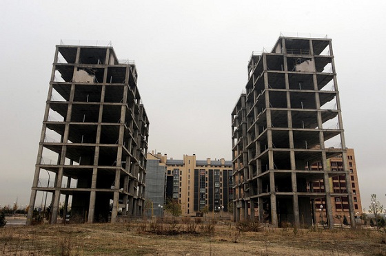 De financiële crisis verraste ook de projectontwikkelaars. Karkassen van flats die voorlopig niet afgebouwd zullen worden. Afbeelding van Bloomberg.