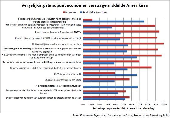 Antwoord economen en gemiddelde Amerikanen op verschillende stellingen, klik voor een grotere versie (Bron: Sapienza en Zingales, 2013)