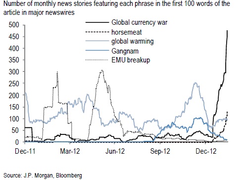 De media zijn belangrijk voor de beeldvorming en JP Morgan levert het bewijs dat de valutaoorlog nu echt aan de orde van de dag is. Beleidsmakers en centrale bankiers kunnen wel ontkennen dat er een valutaoorlog gaande is, maar als we de berichtgeving in de reguliere media mogen geloven is de valutaoorlog toch het belangrijkste actuele onderwerp. Analisten van JP Morgan gingen terug tot december 2011 en telden iedere maand het aantal berichten die vallen onder populaiore thema's als 'valutaoorlog', 'paardenvlees', 'global warming', 'gangman style' en 'uiteenvallen eurozone'. De resultaten zijn in onderstaande grafiek samengevat.