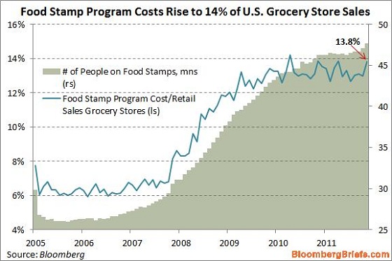 Deze cijfers zijn misschien niet één op één te vergelijken, maar ze maken wel duidelijk dat de Amerikaanse economie steeds meer leunt op overheidsuitgaven. De kosten van de voedselbonnen ten opzichte van de omzet in de supermarkten is meer dan verdubbeld sinds het begin van de crisis, een teken dat men in de VS steeds meer afhankelijk is geworden van de overheid. Gelukkig hoeft de Amerikaanse overheid niet lang stil te staan bij de stijgende kosten van het voedselprogramma, want dankzij de Federal Reserve kan het maandelijks $45 miljard lenen zonder kosten.