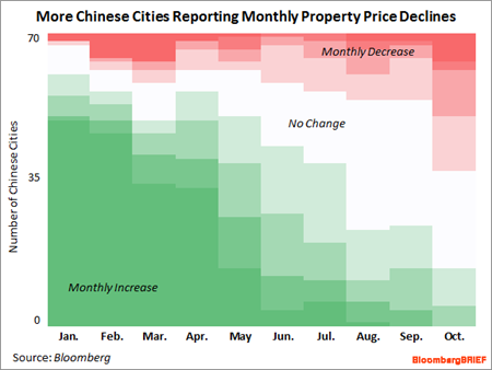 Huizenprijzen stijgen in steeds minder Chinese steden, terwijl de dalingen steeds meer zichtbaar worden (bron: Bloomberg)