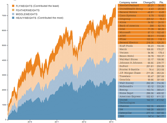 Net als bij onze AEX-index kent ook de Dow Jones een weging toe aan ieder aandeel. Sommige aandelen hebben daardoor veel impact op de koers van de index, anderen leveren nauwelijks een bijdrage. Onderstaande grafiek geeft een beeld van de aandelen die de meeste punten aan de Dow Jones index hebben toegevoegd. IMB, Caterpillar, 3M, Chevron en United Technologies waren de zwaargewichten die het goed hebben gedaan sinds begin 2009. Het aandeel IBM steeg bijvoorbeeld 147% in waarde en was daarmee verantwoordelijk voor bijna 942 punten van de totale stijging van iets minder dan 8000 punten tussen maart 2009 en nu.