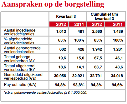 In de kwartaalcijfers van het Stichting Waarborgfonds Eigen Woningen over het derde kwartaal van dit jaar lezen we dat het aantal huisuitzettingen en gedwongen executieveilingen beperkt is gebleven, doordat geldverstrekkers meer inspanning hebben geleverd om de huiseigenaar te helpen met de verkoop van de woning. Door de dalende huizenprijzen zijn de verliezen op de NHG wel verder toegenomen. Het totaal geborgd verliesbedrag steeg van €15 miljoen in het derde kwartaal van 2011 naar €19,6 miljoen in het derde kwartaal van dit jaar. Het waarborgfonds heeft door het groeiend aantal NHG-hypotheken meer garantievermogen op kunnen bouwen. Daar staat natuurlijk ook een groter aantal woningen tegenover met een relatief hoge hypotheeklast, waardoor de verliezen snel kunnen oplopen bij een verdere daling van de huizenprijzen.