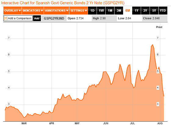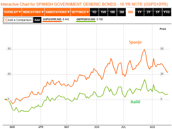 Hoe dan ook, het nieuws kwam goed aan bij de obligatiebeleggers en drukt de rente op 10-jaars Spaanse staatsobligaties terug tot 6,21%. Ook de Italiaanse rente is al behoorlijk aan het zakken en staat op maandag rond het middaguur op 5,73% voor een 10-jaars lening. In juli zagen we de rente op deze leningen nog pieken tot 7,62% (Spanje) en 6,6% (Italië).
