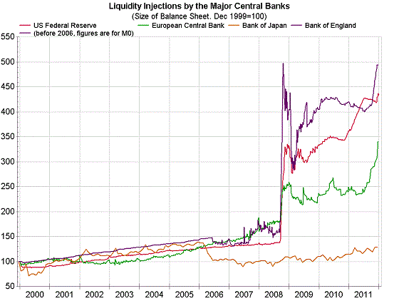 De Japanse centrale bank heeft aangegeven dat het in 2012 voor ongeveer 22 biljoen yen (ruim €200 miljard) in de economie wil pompen via haar 'Asset Purchase Program'. Dit zou gerechtvaardigd zijn door de zwakke economische activiteit in Japan, die volgens de bank het gevolg zou zijn van ''een vertragende economie in de rest van de wereld en het duurder worden van de yen''. Verder maakte de centrale bank bekend haar rentetarief te handhaven op 0 tot 0,1 procent. Ook kwam ze met een nieuw statement, namelijk dat ze streeft naar een inflatie van 1% op de korte en 2% op de langere termijn. Deze intentieverklaring heeft geen directe invloed op het beleid van de centrale bank, maar men hoopt op deze manier de geesten in Japan rijp te maken voor een toekomst met stijgende prijzen. Daarmee volgt de Japanse bank het beleid van de FED, dat er ook op gericht is de geesten van de bevolking rijp te maken voor een hogere inflatie in de toekomst.
