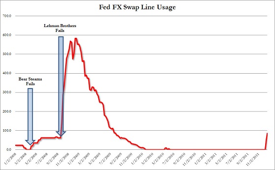 De swap-constructie tussen de FED en de ECB moet Europese banken helpen die moeilijk aan Amerikaanse dollars kunnen komen. De dollars kunnen ze dankzij de swap lenen via de ECB, in plaats van bij andere (Amerikaanse) banken zoals ze dat voor de financiële crisis nog deden. De dollarswap kent een looptijd van 7 dagen, maar kan steeds veieuwd worden zoals onderstaande grafiek van Zero Hedge laat zien. Uit die grafiek blijkt dat Europese banken nog steeds niet van het dollarinfuus losgekoppeld kunnen worden en dat de liquiditeitspositie van verschillende Europese banken nog steeds problematisch is.