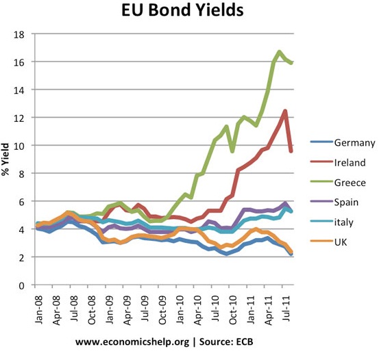 De hoge rente is niet direct een probleem, maar naarmate het land meer schulden moet herfinancieren nemen de rentelasten snel toe, met als gevolg dat er nog meer moet worden geleend tegen de hoge rentepercentages. Een land kan moeilijk zelfstandig uit een dergelijke situatie ontsnappen. De geschiedenis leert ons dat er in het verleden wel vaker schulden zijn kwijtgescholden door overheden. Of dit ook een oplossing is voor de huidige crisis is nog maar de vraag, omdat de obligaties in het bezit zijn van banken en pensioenfondsen die eigenlijk niet veel klappen meer kunnen opvangen.
