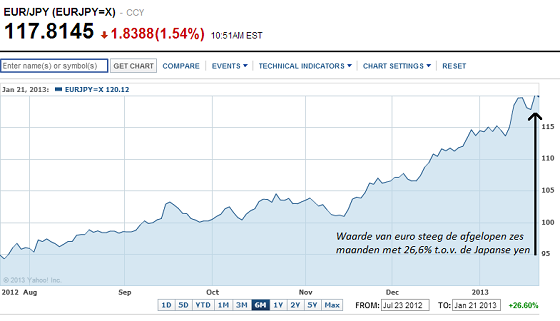 Euro steeg met 26,6% in waarde ten opzichte van de Japanse yen (Bron: Yahoo Finance)