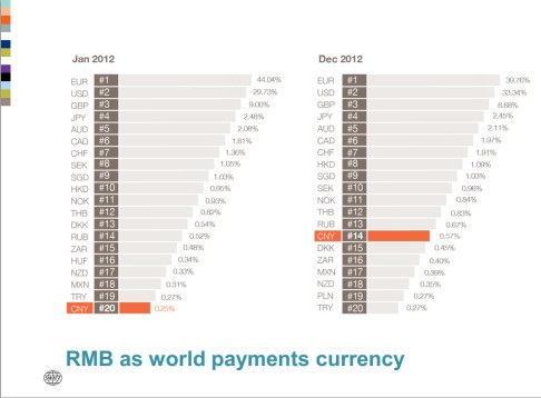 Volgens valutastrateeg Sacha Tihanyi van Scotiabank in Hong Kong is het niet waarschijnlijk dat de Chinese yuan spoedig de euro en de dollar voorbij zal streven als meest gebruikte munt in de inteationale handel. Maar een top 5 notering in de ranglijst van het SWIFT betalingssysteem is volgens Tihanyi binnen vijf jaar zeker mogelijk. Om in de top 10 te komen moet de Chinese munt meer dan 2x zo vaak gebruikt worden als nu het geval is, zodat het marktaandeel stijgt van 0,42% nu naar tenminste 0,9%. Om in de top 5 van de SWIFT ranglijst te komen moet de Chinese yuan vier keer zo veel gebruikt worden als nu het geval is.