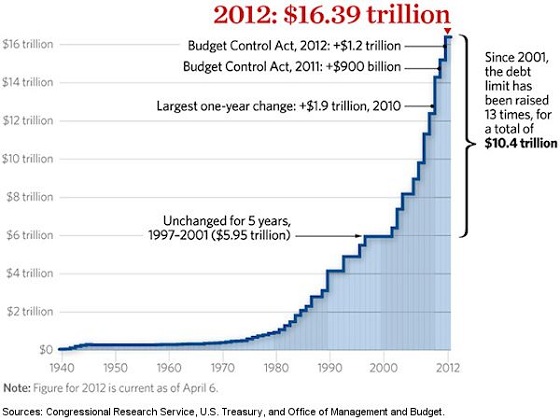 Op het moment van schrijven is de Amerikaanse staatsschuld $16.369.548.799.604,93, slechts $63 miljard verwijderd van het nieuwe schuldenplafond dat in augustus van vorig jaar tot stand kwam. Met het tempo waarin de Amerikaanse overheid nieuwe staatsobligaties uitschrijft wordt de limiet waarschijnlijk binnen een week doorbroken. Daarmee komt het ministerie van Financiën nog niet meteen in de problemen, want Timothy Geithner weet net als vorig jaar een manier te vinden om aan geld te komen. Vorig jaar haalde hij geld uit de pensioenpotten om het schuldenplafond met een aantal maanden uit te kunnen stellen.