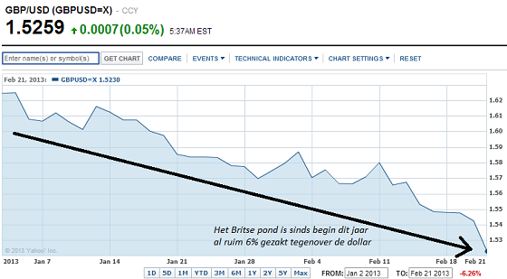 Het Britse pond heeft al ruim 6% van haar waarde verloren tegenover de dollar sinds begin dit jaar (Bron: Yahoo Finance)