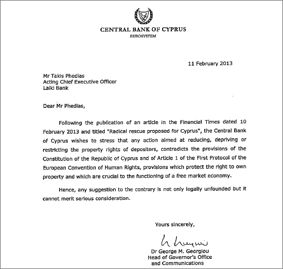 De brief van de Cypriotische centrale bank aan de CEO van Laiki Bank (Via Zero Hedge)