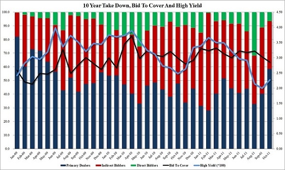 De uitgifte van de $21 miljard aan nieuwe 10-jaars obligaties werd gered door de zogeheten 'Primary Dealers', in de grafiek weergegeven in het blauw. Dit zijn banken en investeringsfondsen, die de staatsobligaties nog altijd zien als een zeer liquide en veilige belegging. Wat de matige belangstelling voor deze obligatieuitgifte verklaard is niet te zeggen. Factoren die zeker een rol spelen zijn de inflatieverwachtingen en de toekomstverwachtingen voor de aandelenkoersen. Een hoge inflatie maakt vastrenderende waardes zoals obligaties minder aantrekkelijk, terwijl aandelen wel enige compensatie bieden voor een stijgende inflatie.