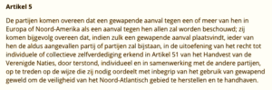 De enige keer in de geschiedenis dat artikel 5 van stal werd gehaald, was na de aanslagen van 9/11 in New York en Washington. Het Taliban-regime in Afghanistan weigerde het brein achter die terreurdaad, Osama bin Laden, uit te leveren. Enkele weken later werden de Taliban door geallieerde troepen uit de hoofdstad Kaboel verjaagd. Dat was het begin, of de hervatting, van een guerrilla-oorlog die tot op de dag van vandaag voortduurt.