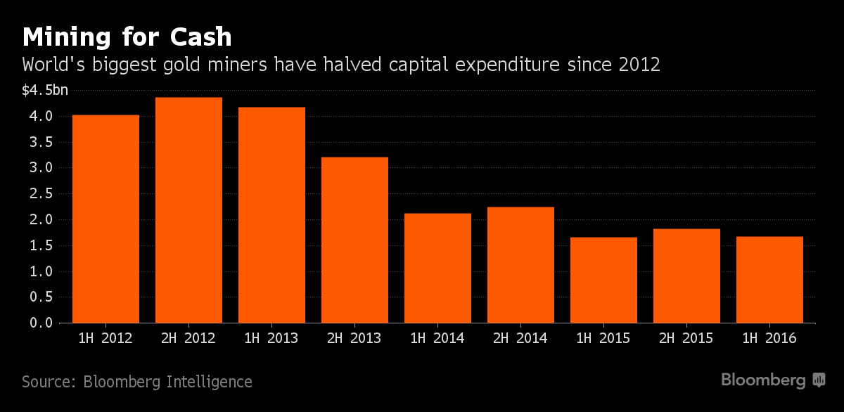 De goudmijnsector heeft niet alleen moeite om voldoende nieuwe goudreserves te vinden, ook hebben ze door de lagere goudprijs moeten bezuinigen op de exploitatie van bestaande mijnen. Sinds 2012 zijn de investeringen van de mijnbouwsector met 41% gedaald, wat betekent dat ze niet genoeg investeringen hebben gedaan om alle reserves uit de goudmijn te halen. Door de lage goudprijs hebben mijnen vooral de hoge kwaliteit gouderts opgegraven.