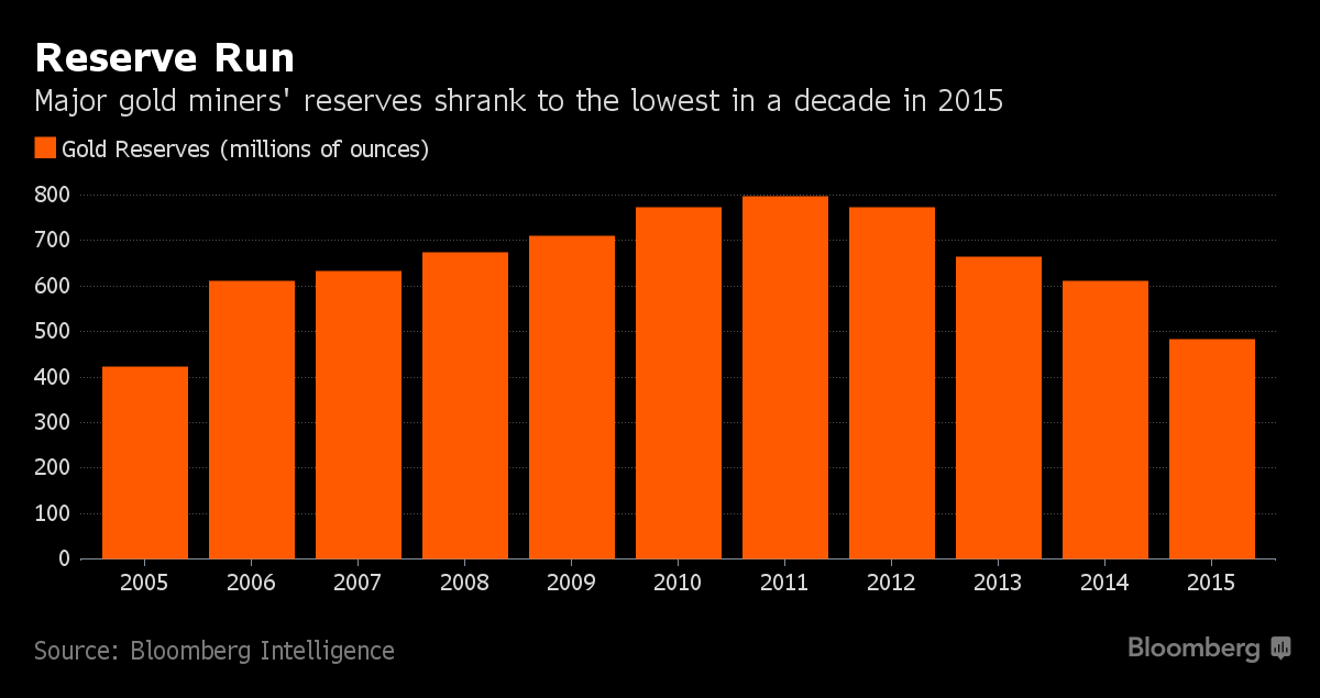 Reserves worden niet aangevuld met nieuwe goudvondsten (Bron: Bloomberg)