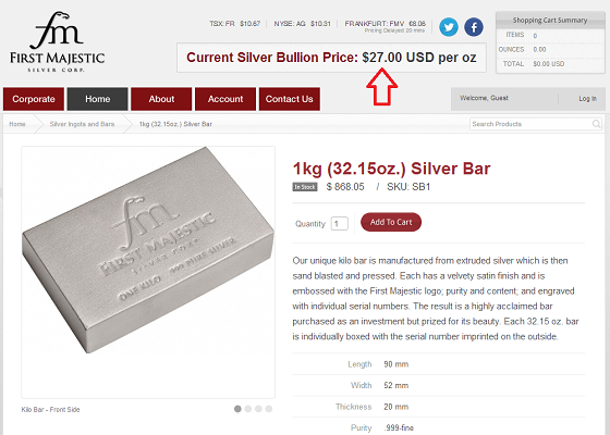 Als eerste nemen we u graag mee naar de webwinkel van First Majestic, waar we twee dagen later nog steeds de vaste prijs van $27 per troy ounce zien. Via deze webwinkel verkoopt de First Majestic zilvermijn zelf geproduceerde zilverbaren en zilveren munten rechtstreeks aan particulieren. Naast deze zilverbaar van 1 kilogram treffen we ook zilverbaren van 5 en 10 troy ounce en munten van 1/2 en 1 troy ounce aan. Wat opvalt is dat al deze prijzen gekoppeld zijn aan die $27 per troy ounce, ook de prijs van de munten.
