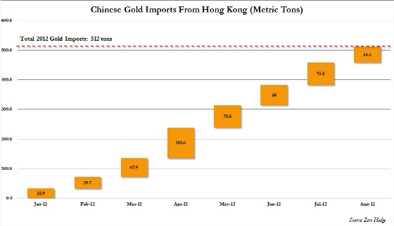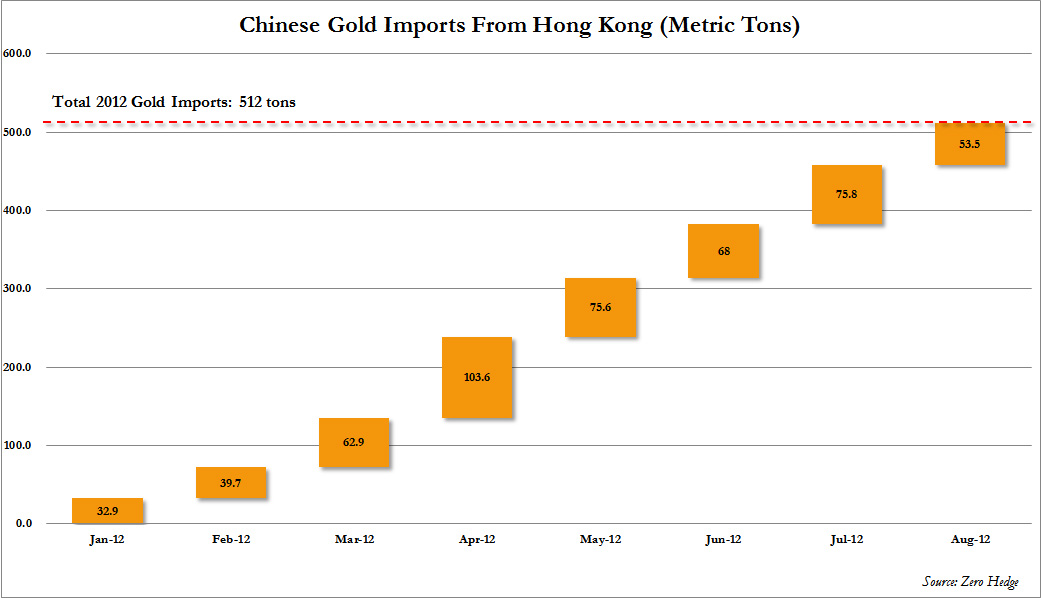 Onderstaande grafiek van Zero Hedge laat zien hoeveel goud de Chinezen dit jaar al hebben geïmporteerd. Daarbij kunnen we opmerken dat er in de eerste acht maanden van 2012 al meer goud is ingevoerd dan over heel 2011. Verder is het noemenswaardig om te vermelden dat er tussen januari en juli al vier keer meer goud ingevoerd is door China dan in diezelfde periode vorig jaar. De nieuwssite Marketwatch kijkt anders naar de cijfers, want die zagen dat de import van goud in augustus het laagst was sinds februari dit jaar. Daaraan verbinden ze de conclusie dat de 'importrally' van goud wellicht tot een einde is gekomen en dat de vraag naar het gele edelmetaal onder de Chinezen bekoeld is. Een analist van HSBC zei er het volgende over: ''China's korte-termijn behoefte aan goud lijkt te verzwakken, omdat de import vanuit Hong Kong vertraagde''. Ook was er anekdotisch bewijs van een goudhandelaar in Hong Kong, die overigens niet bij naam werd genoemd. Die zou van klanten in China te horen hebben gekregen dat hun goudvoorraad verzadigd is.