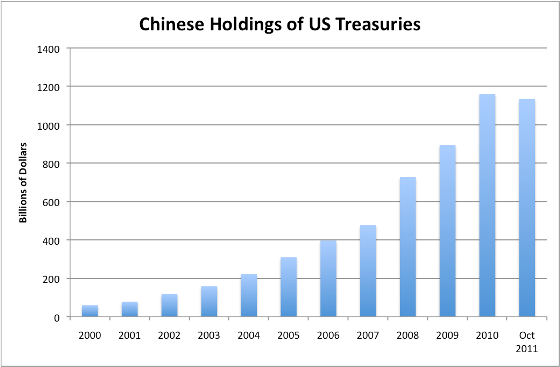 Totaal aan Amerikaanse staatsobligaties in handen van Chinese centrale bank (Bron: Avondaleam)