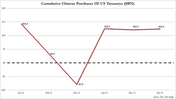 De TIC-data laat zien dat China de laatste maanden beperkt reserves omzet in Amerikaanse staatsobligaties (Bron: Zero Hedge)