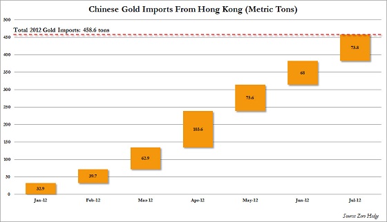 De totale Chinese import van fysiek goud via Hong Kong bedroeg in de eerste zeven maanden van dit jaar 458,6 metrische ton. Daaaast werd er in China in de eerste vijf maanden van dit jaar 140,7 ton goud gedolven, een stijging van 6,59% ten opzichte van de eerste vijf maanden van vorig jaar. Als we deze waardes zouden extrapoleren voor de rest van 2012 levert dat een totale goudimport van 786 ton en een binnenlandse productie van 378,43 ton op.