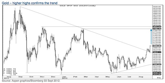 Tom Fitzpatrick baseert zich op technische analyse van de goudprijs over het afgelopen jaar. Daaruit haalt hij een negatieve trendlijn, die onlangs krachtig doorbroken werd. Ook doorbrak goud voor het eerst sinds lange tijd het 200-daags en het 55-weeks gemiddelde en werden er twee achtereenvolgende weken geregistreerd waarop de goudprijs steeg. Dat opent volgens Fitzpatrick de weg naar boven, waarbij het niveau van $1.791 per troy ounce getest zal worden. Wordt dat niveau vervolgens ook doorbroken, dan ontstaat er volgens Fitzpatrick een patroon van een dubbele bodem, dat een koersdoel kan geven van $2.060 per troy ounce.