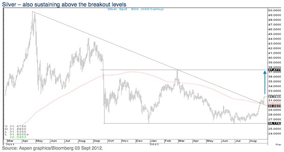 Door de opwaartse koersbeweging staat de zilverprijs voor het eerst sinds april weer boven de symbolische grens van $30 per troy ounce en is ook het 200-daags gemiddelde eindelijk doorbroken. Dat gebeurde voor het laatst in februari, toen de zilverprijs in korte tijd van $33 naar $38 wist te stijgen. Voor technisch analisten is het doorbreken van het 200-daags gemiddelde een sterk koopsignaal, al was de bodemvorming rond de $28 gedurende de zomer ook een goed koopsignaal. In euro's uitgedrukt staat de zilverprijs nu op €25,19 per troy ounce en €809,82 per kilo.
