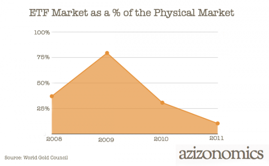 Op Azizonomics verscheen een nieuw artikel waarin de omvang van de 'papieren' goudmarkt wordt vergeleken met de fysieke goudmarkt. Op basis van data van het World Gold Council werden de volgende grafieken opgebouwd, die laten zien hoeveel vermogen beleggers hebben verhandeld in de verschillende goud-ETF's en in fysiek goud (baren en munten). Van 2008 naar 2009 was er een grote instroom van vermogen richting de goud-ETF's, maar bleef de handel in fysiek goud in omvang vrijwel gelijk. Azizonomics legt het als volgt uit: [dikgedrukt is nadruk redactie]