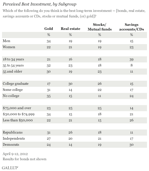 In de verschillende leeftijdscategorieen blijkt de jongste groep (18-34 jaar) een sterke voorkeur te hebben voor spaargeld op de bank (39%), terwijl de oudere groepen (35-54 jaar en 55+) juist meer richting goud bewegen als zijnde de beste lange-termijn belegging. Onder studenten is vastgoed nog steeds behoorlijk populair (30%), terwijl de mensen die geen hogere opleiding gevolgd hebben juist positief zijn over goud (35%). Van aandelen moet die laatste groep niet veel hebben (11%), maar spaargeld bij een bank is dan wel weer populair onder de lager geschoolde Amerikanen (24%). Tenslotte lijken de democratische kiezers een sterke voorkeur uit te spreken voor geld op een spaarrekening, terwijl republikeinse aanhangers en 'onafhankelijken' hun voorkeur uitspreken over goud.