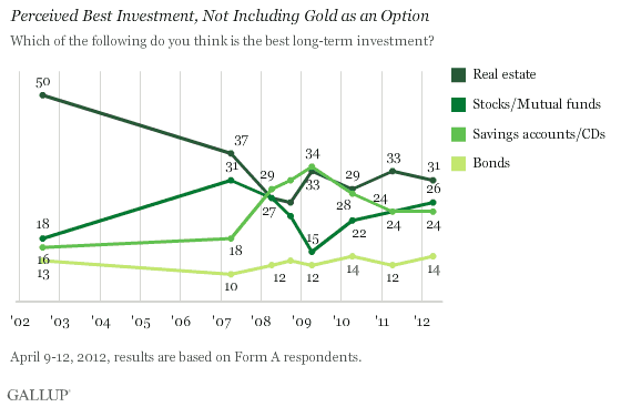 Vergeleken met de vorige peiling van begin augustus 2011 heeft goud wel wat aan populariteit verloren, maar is het nog steeds de belegging waar de meeste respondenten de hoogste verwachting van hebben op de lange termijn. De daling van 34% voorkeur toen naar 28% nu zal ook deels te verklaren zijn door het feit dat de goudprijs toen veel hoger stond en snel aan het stijgen was. Met 28% van de voorkeursstemmen geven de respondenten aan de hoogste verwachting te hebben van goud als belegging, want andere beleggingsvormen als vastgoed, aandelen en spaarrekeningen volgen met respectievelijk 20% en twee maal 19%. Amerikanen hebben er weinig vertrouwen in dat staatsobligaties een goed rendement gaan geven, hiervoor kiest slechts 8% van de respondenten. Dat is overigens nog minder dan de 10% die in augustus nog voor deze langetermijn belegging koos.