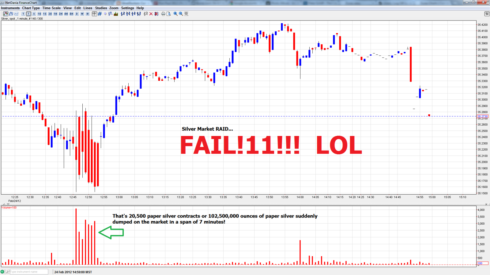 De mislukte aanval in de termijnmarkt voor zilver op vrijdag 24 februari 2012 (Bron: SilverDoctors)