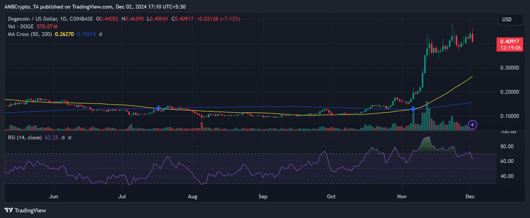 Dogecoin heeft onlangs een zeldzaam Golden Cross gevormd, wat wijst op een mogelijke bullish trendomkeer. Als DOGE de weerstand van $0,4739 doorbreekt, kan het doel $0,5005 zijn en mogelijk zijn all-time high van $0,7316 bereiken.