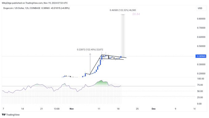 Marktexperts zeggen dat aanhoudend bullish momentum tijdens deze bull run Dogecoin in 2025 naar $1 kan stuwen. Raoul Pal, een voormalig Goldman Sachs-directeur, wees op een wigpatroon op de maandelijkse grafiek van DOGE en voorspelt een explosieve breakout, vergelijkbaar met de recente 377%-rally van XRP.