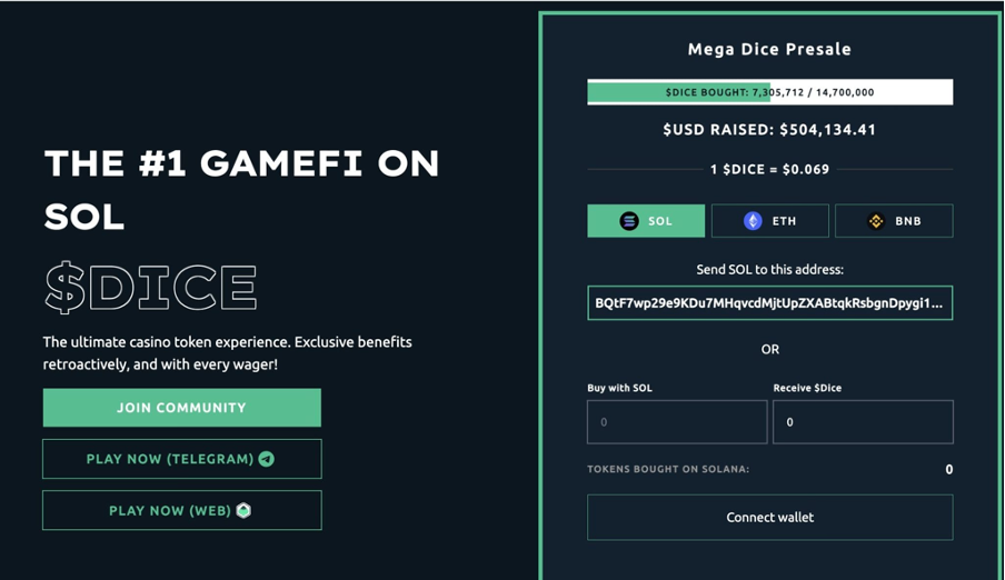De presale van Mega Dice is een groot succes en heeft al bijna $ 1,5 miljoen opgehaald. De token wordt ontwikkeld op de Solana blockchain, maar is ook te koop middels ETH en BNB. Tokens kosten op dit moment $ 0,075 per stuk.