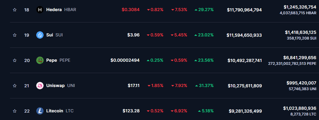 Als Pepe blijft groeien in populariteit, kan hij binnenkort ook SUI met zijn market cap van $11,6 miljard inhalen. Iets hoger dan SUI ligt Hedara (HBAR) met een market cap van $11,8 miljard. In het geval dat $PEPE naar $15 miljard stijgt, komt het in de top 15 cryptomunten.