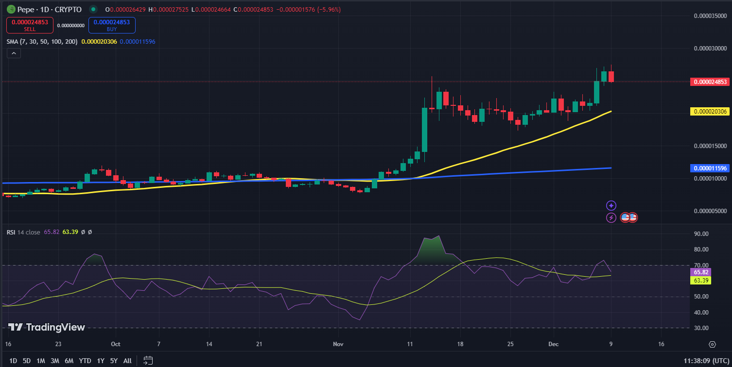 Op het moment staan utility tokens meer in de schijnwerpers dan meme coins, desondanks zit PEPE in een stijgende trend sinds eind november. Bovendien heeft PEPE vannacht een nieuwe all-time high neergezet op $0,00002748. Het feit dat PEPE dit jaar vaak een nieuwe all-time high heeft bereikt, is een teken dat hij nog verder kan stijgen.
