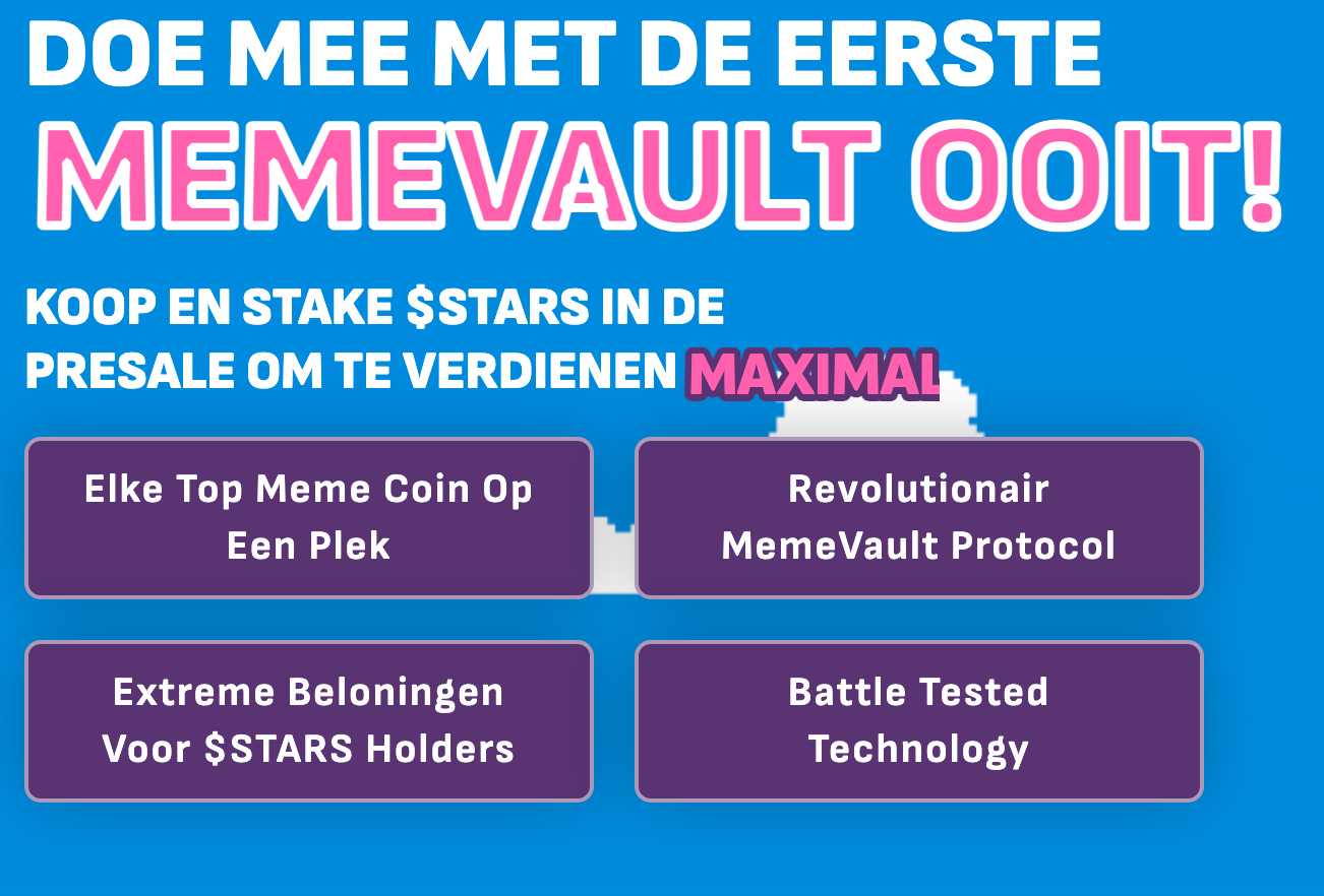 Crypto All-Stars ($STARS) trekt met name zoveel aandacht dankzij het staking protocol ‘MemeVault’. Binnen deze MemeVault kunnen de investeerders bekende meme coins staken onder één dak met een zeer aantrekkelijk rendement. Denk aan meme coins zoals Dogecoin, Pepe en Shiba Inu. $STARS is het eerste platform waarbij er een groot aantal meme coins van verschillende chains onder één Smart Contract gestaked kunnen worden.